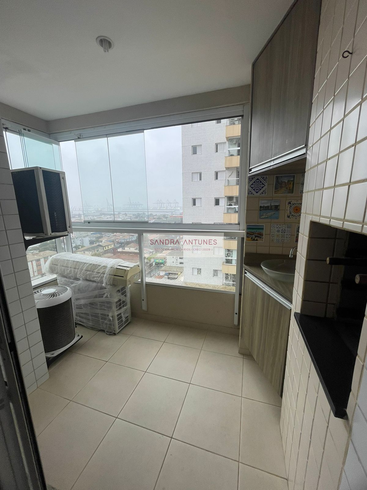 A varanda gourmet possui churrasqueira a carvão e proporciona uma vista privilegiada para o Porto de Santos, ideal para momentos de lazer e descanso.